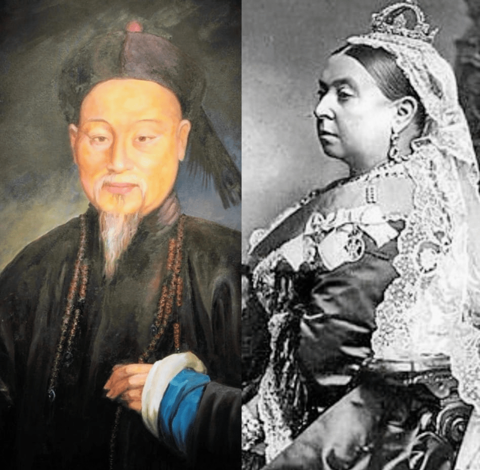 Izquierda, retrato de Lin Zexu, el funcionario chino de la dinastía Quing que le envió una histórica carta a la reina Victoria de Inglaterra (derecha) aclarándole que «los mercaderes bárbaros de vuestro país, si quieren negociar por un período prolongado, se les requiere obedecer nuestros estatutos con respeto o cortar permanentemente el flujo de opio».