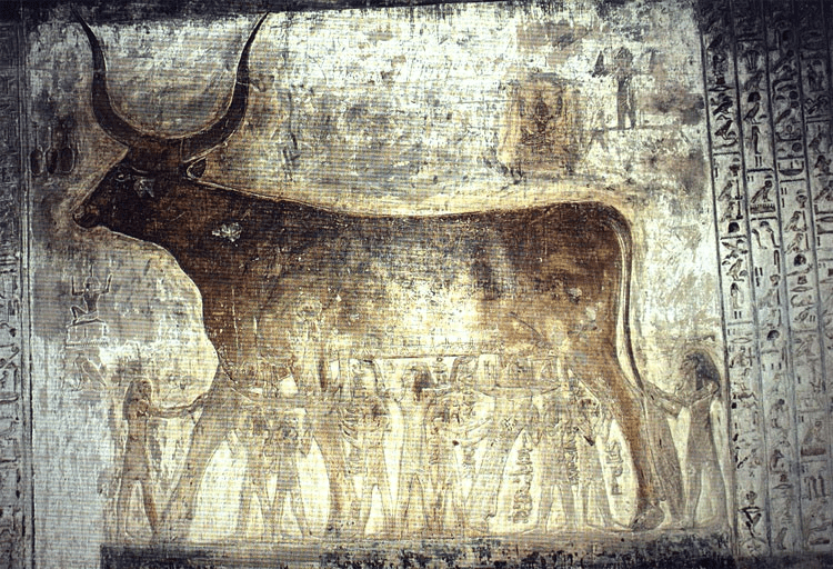 Cuando Yahvé eligió a los israelitas como su pueblo y los sacó de la esclavitud de Egipto, los hizo pasar por las aguas del Mar Rojo. Isis concibe a su vástago Horus cuando su esposo Osiris está flotando muerto en las aguas del Nilo. Las aguas también son solidarias con la Luna y el elemento femenino. El dios sumerio Sin era figurado con una barba larga y cuadrada de color azul lapislázuli, símbolo del cielo estrellado y las aguas femeninas. Es interesante notar que, en la iconografía cristiana a María, por lo general, le pintan sus vestidos de color azul lunar. La misma asociación aparece en el Nuevo Testamento en Apocalipsis 12: 1, 2, que nos habla de una mujer parada sobre la luna. Teniendo en cuenta estos datos, veamos las diferencias fundamentales con relación a la cosmología egipcia; y nos daremos cuenta, él por qué de la ausencia de un mito del Diluvio al estilo bíblico-oriental.