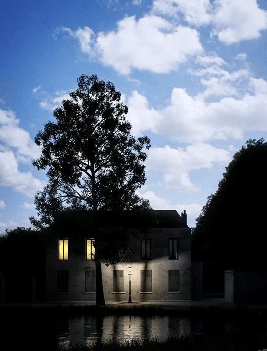 Los opuestos pueden reconciliarse en la unidad de la imagen. Esa unión genera un intenso efecto surreal. Esto ocurre en la célebre serie de Magritte El imperio de las luces.