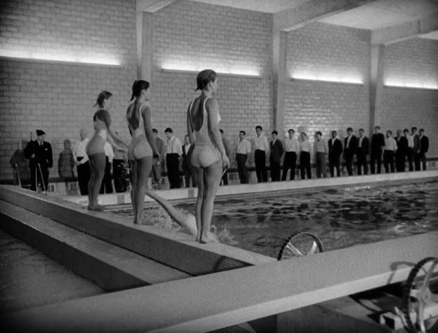 Y la forma de muerte principal administrada por el poder es imaginada por Godard como espectáculo en una piscina; como limpieza de la escoria inadaptada por el agua y un ballet femenino. Los condenados pueden hacer su descargo catártico antes de recibir una descarga letal de ametralladora y caer en la piscina. Hablan de los valores perdidos, la generosidad, la nobleza, el sacrifico. Defienden la emoción frente al cálculo, la individualidad frente a la impersonalidad tiránica.