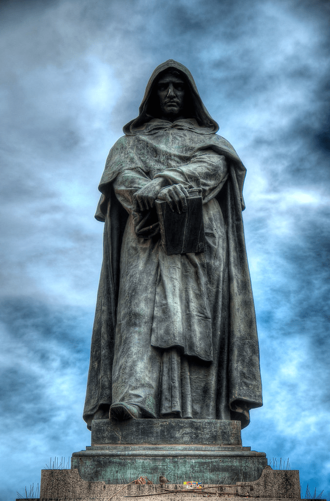 Giordano Bruno, el sacerdote al que le interesó más la filosofía y la ciencia que la teología, el que pensó libremente, y que por su razón crítica llegó a una filosofía que causó estupor en la Iglesia, que lo persiguió a través de la Inquisición y que, finalmente, después de largo proceso, lo quemó en la hoguera como hereje, en el 1600.