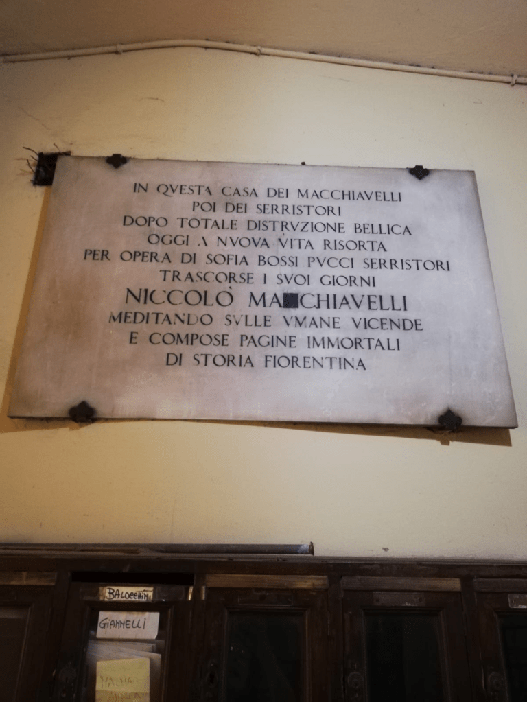 Placa que anuncia al viajero que en la casa de foto anterior vivió Nicolás Maquiavelo, el autor de El príncipe..