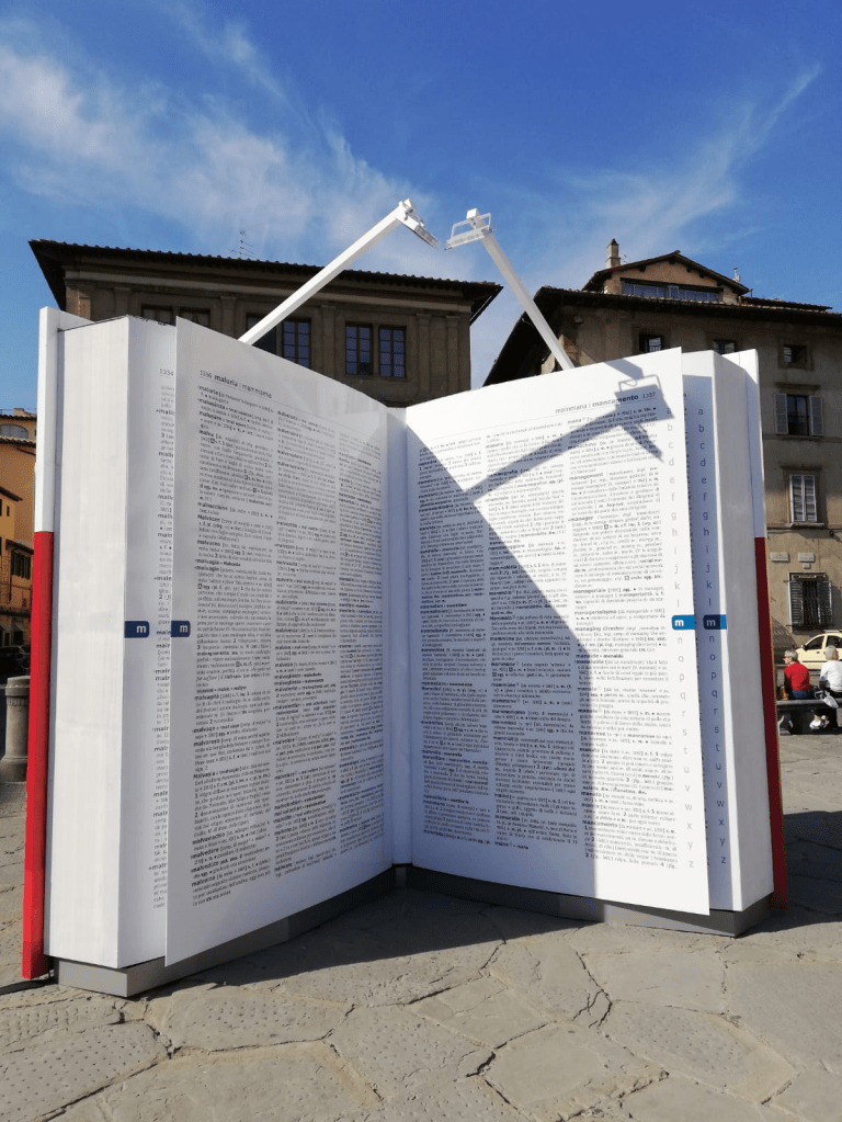 Gran libro impreso abierto en la plaza frente a la Iglesia de Santa Croce.