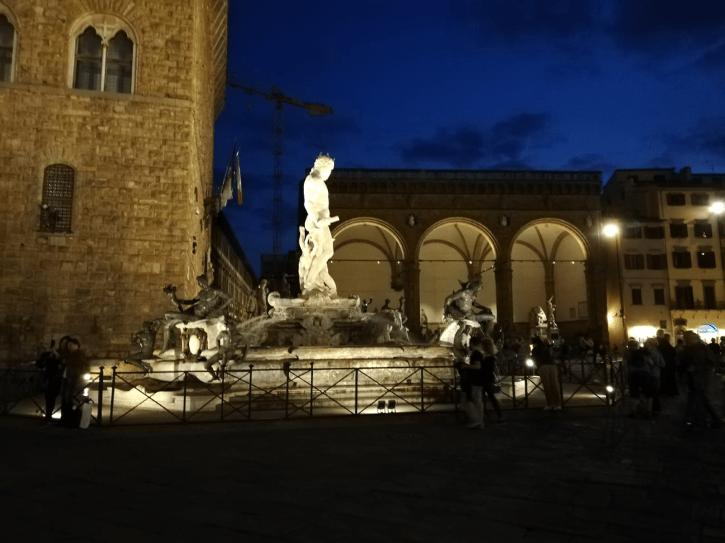 Visión nocturna de La fuente de Neptuno, junto al Palacio Vecchio.