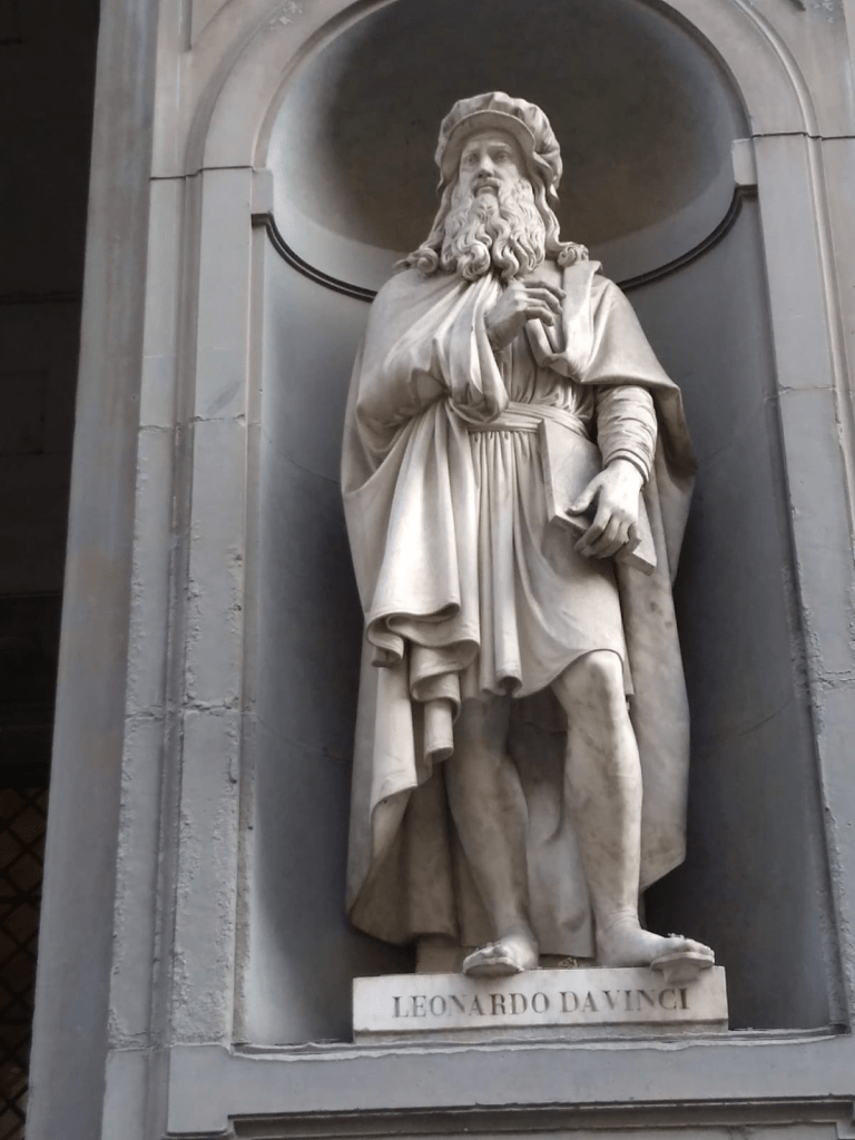 Estatua de Leonardo en patio interior de Galería de los Uffizi. En nuestro canal se puede ver este video como acceso visual a su obra La mente de Leonardo y la apertura a lo universal (también abajo, en apéndice).