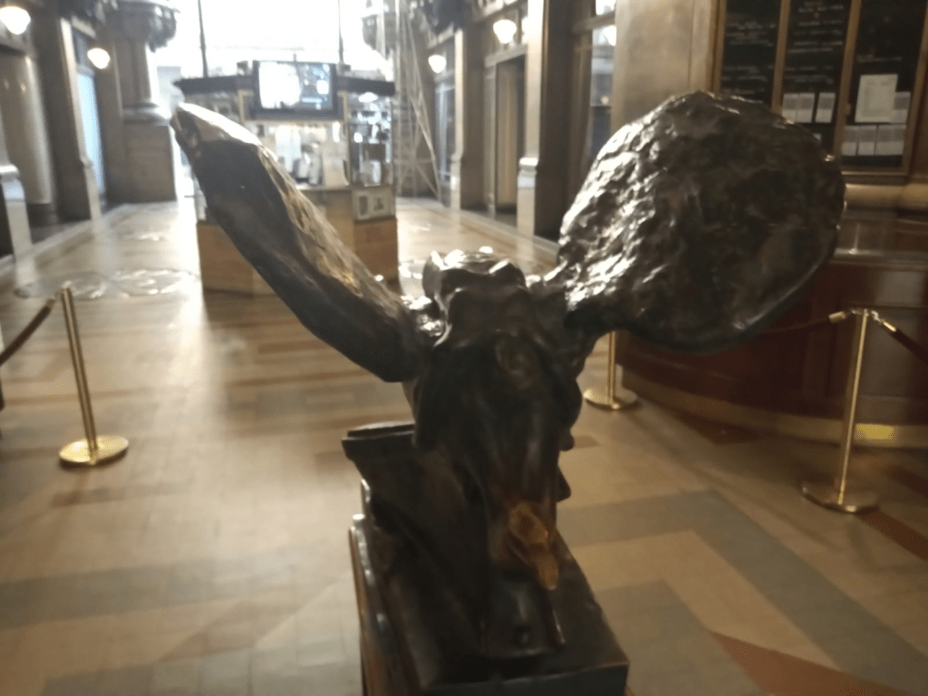 Su destino original era el hall central. La estatua desapareció por razones desconocidas. En 2015, se construyó una réplica para ubicarla en su sitio original, pero la pieza extraviada fue finalmente ubicada en manos de un coleccionista en Mar del Plata, aunque incompleta. La escultura en bronce, al fin recuperada, reposa en su lugar predestinado, y se apresta a su vuelo, aureolada por el enigma.