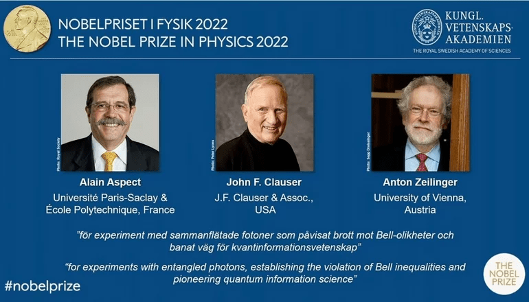 El premio Nobel de Física de 2022 fue concedido a tres científicos cuyos investigaciones se relacionan con «el “entrelazamiento cuántico”, un mecanismo en el que dos partículas cuánticas están perfectamente correlacionadas, independiente de la distancia entre ellas», según lo que anunció el jurado que otorgó la famosa distinción.