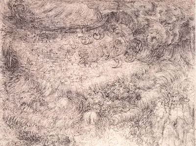 Y otro movimiento, de energía mucho más inmediata, enloquece los aires, desgarra la atmósfera en corrientes de energías poderosas. Es lo que ocurre en la serie de Dibujos del Diluvio de Leonardo. Este ímpetu de los vientos y, más allá, la percepción de una tierra dinámica recupera la compresión de la naturaleza como poder superior que amenaza y eventualmente destruye la soberbia humana. Como se ve en uno de los dibujos del Cuaderno de Windsor, Diluvio con pueblo destrozado al pie de una montaña.