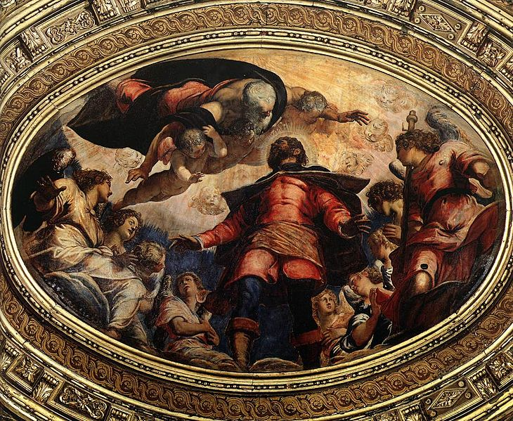 Entramos al edificio renacentista. En su piso superior se aloja la sala grande con obras de Tintorreto. Un gran ciclo de pinturas de temática religiosa en la madurez del gran maestro, discípulo de Ticiano.