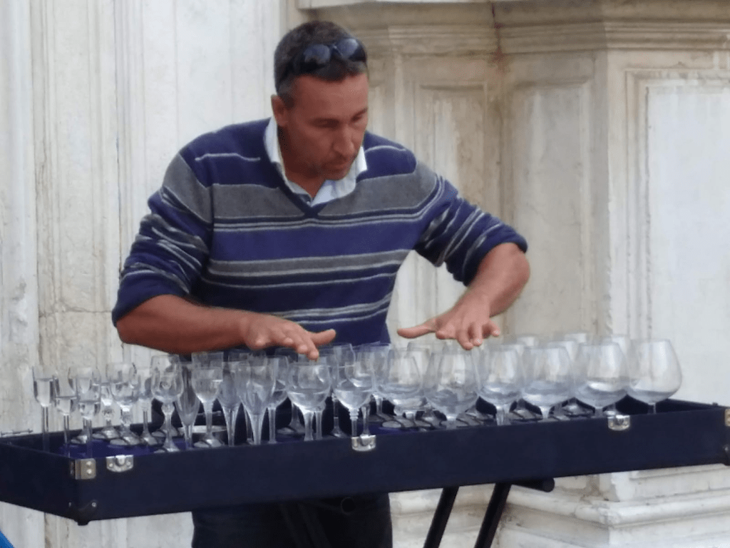 En uno de los espacios abiertos entre las callejuelas que actúan como una suerte de plazas secas, encontramos a un artista callejero que le arranca sonidos a un conjunto de vasos.