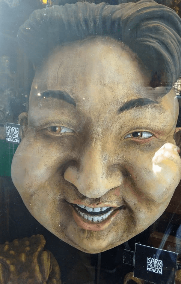 Dejamos nuestro juego de sombras chinas, y de inquietudes filosóficas, y pasamos frente a nuevos negocios. Vemos nuevas máscaras. Una es diferente: la reproducción grotesca de líder de Corea del Norte, Kim Jong-un.