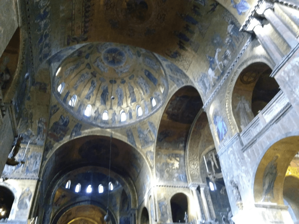 Y contemplamos, finalmente, la basílica de San Marcos. La obra de arte máxima del arte bizantino véneto, que se construyó con el fin de alojar las supuestas reliquias de San Marcos evangelista traídas desde Alejandría. La actual basílica se inició en 1063. El edificio se fue enriqueciendo por una ley de la República de Venecia que imponía que los mercaderes exitosos en sus negocios debían hacer donaciones para embellecer el santuario. La parte inferior de la fachada muestra arquivoltas del siglo XIII y XIV, con una gran puerta de bronce. El orden superior se caracteriza por un gótico florido.