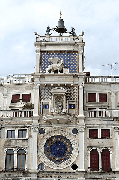 En la Plaza de San Marcos también se encuentra la Torre dell’Orologio, es decir la Torre del reloj, el reloj de San Marcos, con varias esferas concéntricas, una de ellas representa los signos del zodiaco. Sobre el reloj, Mauro Coudussi, el arquitecto de la obra, dispuso una Virgen y un niño, un león de San Marcos, y dos figuras de bronce oscurecido, que tocan una campana cada hora y que le dan a la torre el nombre alternativo de Torre del reloj de los Moros. La torre fue construida como otra expresión de la opulencia veneciana.