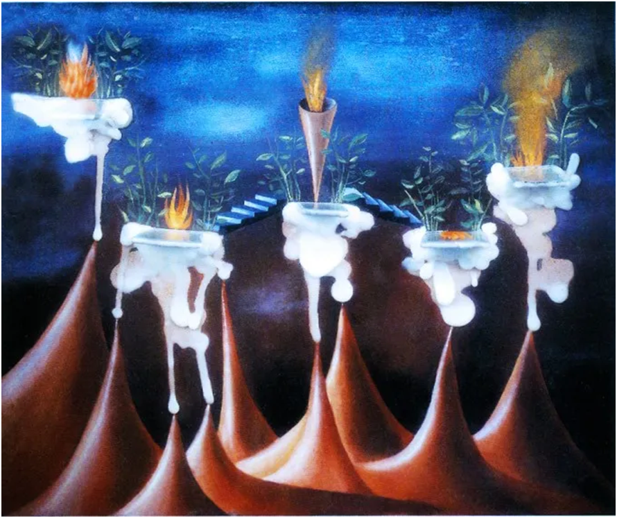 Su surrealismo es encuentro en otro espacio de seres fantásticos, luminosos, animales aéreos, gigantes, presuntos magos, laberintos circulares, movimientos envolventes de seres, ríos vertidos por cántaros, árboles, ramas y figuras celestes, probables espectros, caballos transformados, suertes de jirafas con rostros felinos. Un mundo surreal que libera las posibilidades imaginativas inagotables; la faz del mundo de lo recientemente creado, y con la música de lo que siempre une lo distinto y extraordinario.