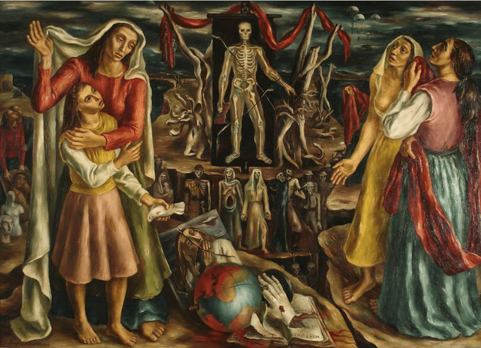 La expresión del dolor y la transformación son centros dinámicos de la pintura de Forner: la guerra que deshumaniza, atiza el horror, mata a los seres queridos, hace que la paz y la esperanza sean solo débiles abstracciones. Una gramática de figuras sufrientes pueblan las series de España y El drama. Mujeres que piden alguna explicación o consuelo frente al espanto, y a los cuerpos despedazados y los esqueletos. El camino del expresionismo, pero también con perfiles surrealistas que une manos abiertas y sangrantes con restos de una pared roja, raíces o un misterioso ser vestido de blanco, como en La caída.