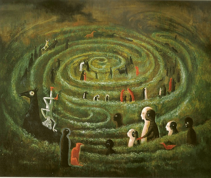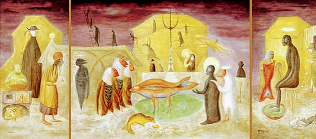 En su horizonte creativo gravitan de forma decisiva la alquimia, el misticismo, y también el psicoanálisis en las variantes de Freud, Jung y Alfred Adler. En su cuadro de 1960, Mujer Saliendo del Psicoanalista se advierte la alusión a la terapia psicoanalítica.