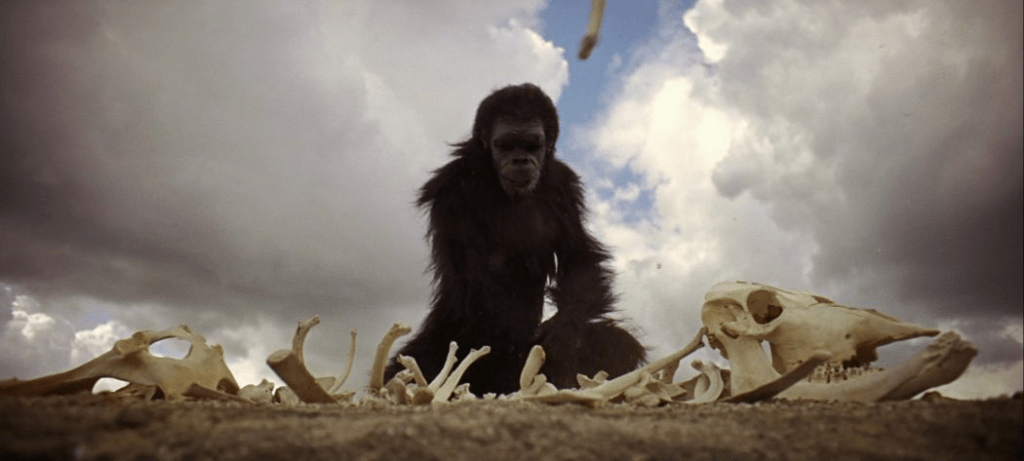 Clarke reproduce un presupuesto evolucionista fundamental. En el comienzo es la precariedad sin saber, ni conciencia. Lo inferior. Luego, en un incierto futuro, se abren las plumas del saber universal y, lentamente, se desplazan las aguas de la evolución. Un proceso que el film de Kubrick representa cuando la primitiva arma de hueso vuela en el aire tras ser arrojada por Moon-Watcher, para después transformarse en una futura y evolucionada nave espacial.