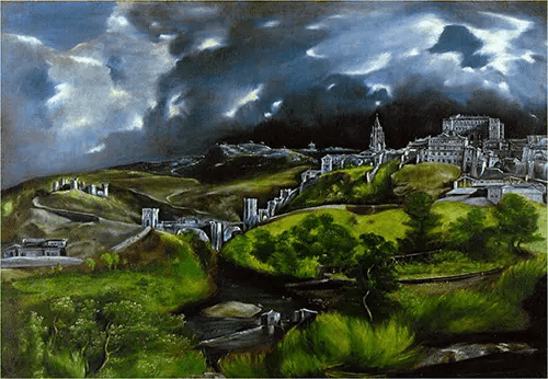 Tomo la mano de Laura otra vez, y el cielo se oscurece, rápido. La noche se avecina con nubes de tormenta. Y no muy lejos del Castillo de San Servando, en el camino de descenso hacia la estación de tren y el viaje de vuelta a Madrid, imagino entre las sombras alguien que despliega un caballete, y manipula una paleta de pintor. Desde allí puede ver toda la ciudad. El cretense que terminó sus días en la bella ciudad imperial de la época de Carlos V, repite su vista famosa de la Toledo.