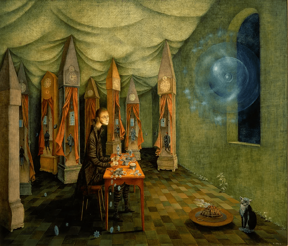 de la vibración escondida del tiempo en La revelación o el relojero (1955). En un recinto rodeado acaso de noche o de vacío, se erigen relojes pendulares, de madera lustrosa. En sus discos se deslizan las agujas. Discos sólidos que indican el paso del tiempo cotidiano, el tiempo del insumo humano. Pero otro disco de aspecto traslúcido y flotante se apresta a traspasar una ventana, y a salir a la negrura exterior. O acaso viene de allí. Un gato acompaña al relojero que, ensimismado, ve el disco etérico y la negrura cósmica de la noche, el abismo del misterio desde el que emana el tiempo, sin que entendamos cómo.