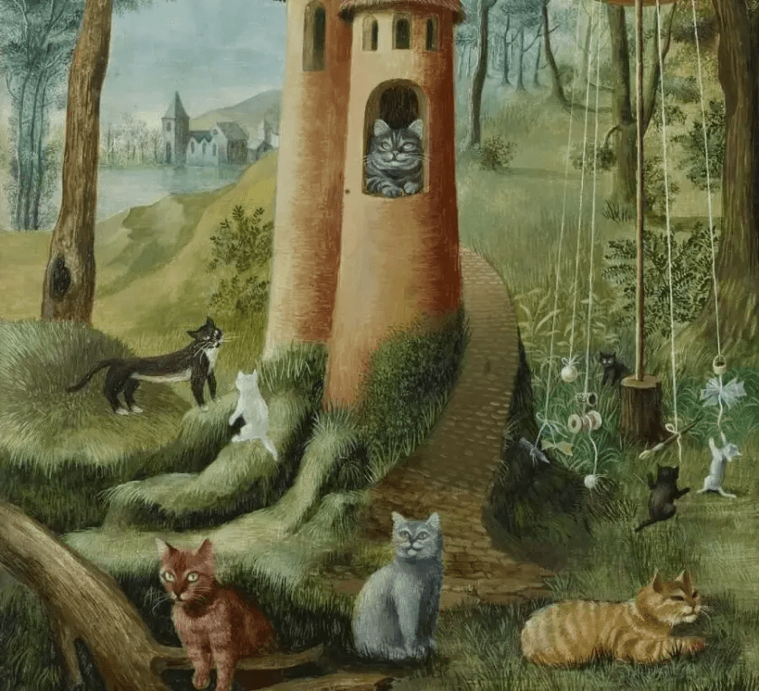 Por la conciencia del tiempo, el humano no vive plenamente en su presente; su ánimo suele estar proyectado hacia el mañana, el futuro, y el temor a la muerte. En el paraíso solo se vive en un presente continuo. Pero para Remedios Varo el paraíso nunca es posibilidad humana. Del reino paradisíaco, el animal está más cerca dado que, en su inconciencia (que acaso es una forma superior de conocimiento), vive en el puro presente, donde no se teme el mañana de la muerte. Y los habitantes de ese paraíso animal son los felinos en El paraíso de los Gatos (1955).
