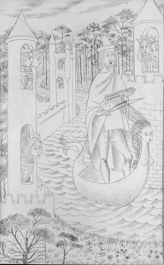 Un poeta, con atuendos de la edad media, se muestra junto a torres y murallas desde la que surgen mujeres medievales, en torno a un estrecho río sobre el que una sirena se metamorfosea en una embarcación, y su suelta cabellera son los hilos extendidos de un arpa-cuerda. Con un plectro, el rapsoda se prepara para hacer sonar las cuerdas-cabellos de la sirena-mujer, como si fuera la prolongación visible de la naturaleza y su poder enigmático. La poesía como arte de hacer resonar lo que ya resuena en la complejidad del mundo natural. El rapsoda, el poeta, el artista, que resuena desde las vibraciones de la materia fluida.