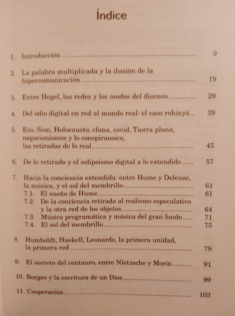 En su camino argumental convoca, por ejemplo, a Heráclito, cuando nos ilustra sobre esa “naturaleza que ama ocultarse”, a Georges W. Hegel que declama la dialéctica de un Espíritu que se desarrolla hasta conocerse a sí mismo. Invoca además a David Hume y a Gilles Deleuze. Recorre los pasillos de esas bibliotecas interminables que imaginara Jorge Luis Borges, la física de Isaac Newton, la crítica de Heidegger, las imágenes simbólicas de Stanley Kubrick y la complejidad en Edgar Morin. Dicho sea de paso, nos avecina a otra potencialidad reflexiva en la cual no está ausente la mística, la estética literaria, igualmente su propio aporte de ficción que nos exhorta a la consideración infinita de aquella “otra red”, única en su especie, necesaria y luminosa que, a pesar de su fulgor, no todos pueden ver.