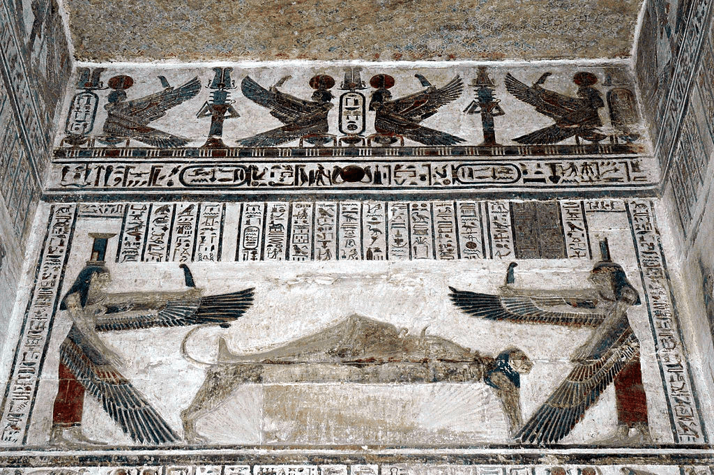 Analicemos la estructura de la tumba para poder comprender la mitología del más allá. El emplazamiento era simbólicamente el duat (caída solar en el horizonte) y el amduat (el sol recién sumergido debajo de la tierra) en su totalidad. Dijimos que la tumba clásica que estudiamos está compuesta por la cámara real (amduat) o la cámara del sarcófago. Según Campbell, tomando como referencia el ataúd de Tut-Anjamon, teorizaba que este tenía siete niveles. Uno: el cuerpo; dos: el sudario, con inscripciones de El libro de los Muertos; tres: la máscara funeraria; cuatro: el sarcófago de madera con la forma del muerto; cinco: el ataúd que lo recubría que era rectangular y de oro; seis: el ataúd de piedra, y siete: la habitación misma, la cámara. Esta se encontraba con el Gran Sarcófago cósmico que era la totalidad del universo del cual Osiris era el gobernante eterno. Luego Campbell lo va a comparar con los chakras del yoga que, como veremos, no es descabellado.