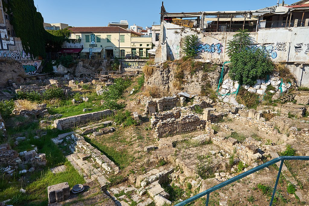 Esquina noroeste de la Poikílē stoá o ‘Pórtico Pintado’, en primer plano (año 2020) (Wikimediacommons)