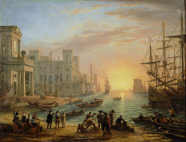 La luminosidad solar fluye difusa y concentrada y abraza el día, un puerto, el mar de azul espumoso, el deambular de las personas en botes, en el muelle, en escalinatas, junto a barcos, velas, proas, columnas, torres, árboles, banderas. Es la escena pictórica favorita de varios obras del pintor barroco francés Claudio de Lorena, del siglo XVII, donde sobresale la expansión de la luz solar en escenas portuarias, como en Puesta de sol en un puerto (1639); el Paisaje con el embarque en Ostia de santa Paula Romana (1639-1640, realizado por encargo del rey de España Felipe IV para decorar el Palacio del Buen Retiro, hoy en el Museo del Prado; o el Puerto con el embarque de la Reina de Saba (1648), actualmente en la  National Gallery de Londres.