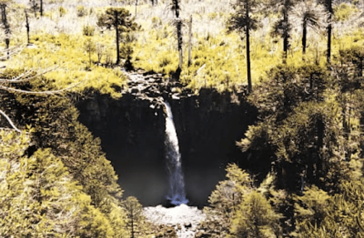 Al día siguiente, el dueño del camping nos marcó, carta mediante, los senderos más interesantes de la zona. Muchos pasan por estancias privadas y se los puede recorrer con permiso del dueño. Pasamos una vieja casona luego de una hora y media de caminata y seguimos, a campo traviesa, hasta una meseta cortada a cuchillo; una roca en forma de trapecio que, en su interior, como un volcán en miniatura ampara a una laguna. Otro día pasa, y nosotros caminamos hacia otro camping. Está menos poblado que el anterior, y a la vera del río Pulmarí. El guardaparque nos indica una caminata ineludible. Como quien dice en el patio de su casa tiene una cascada de 10 metros de caída que forma una cueva con la roca. Por un costado, se pasa a su interior sin salpicaduras. A través de la melena de agua se llega a ver el lago Ñorquinco recortado por la vegetación.