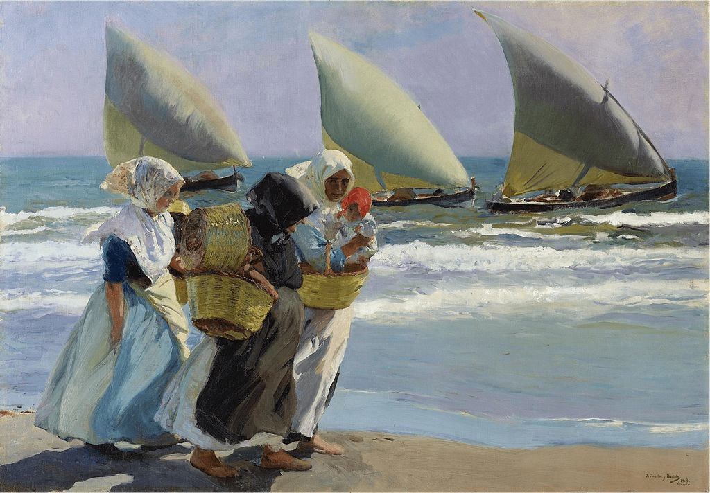 Joaquín Sorolla (1893-1923), el pintor valenciano, es uno de sus grandes representantes. Su pintura, de hecho, rebosa en luminosidad, enérgicas pinceladas que exaltan la luz y el color. Su pincel se embelesa en escenas de playas (que incluyen las pinturas sobre las rompeolas de San Sebastián, en el País Vasco), días soleados en proximidad de las olas, de bañistas, caminantes y pescadores, aire libre y personajes en ambientes naturales. También se destacó en la pintura de retratos, que incluyó personajes de la realeza española, y otras figuras importantes de su tiempo.