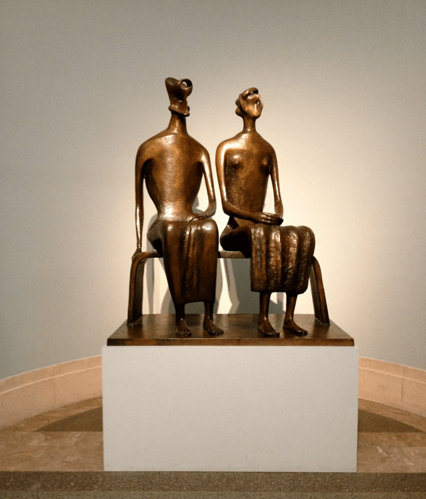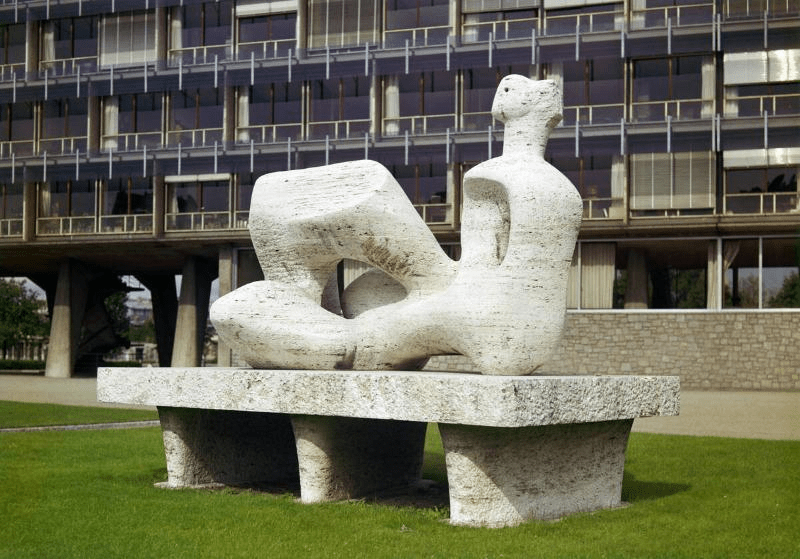 HENRY MOORE (1898-1986), es el escultor británico que transitó entre el modernismo, la abstracción, y el nexo entre figura humana y naturaleza. Sus fuentes son múltiples: el arte y arquitectura primitivos, las figuras reclinadas de dioses de la cultura tolteca-maya-azteca, y las formas orgánicas de la naturaleza, y la interacción con el entorno natural. En su obra, el cuerpo adquiere una estilización abstracta, como si se quisiese capturar una esencia detrás de las cambiantes apariencias.