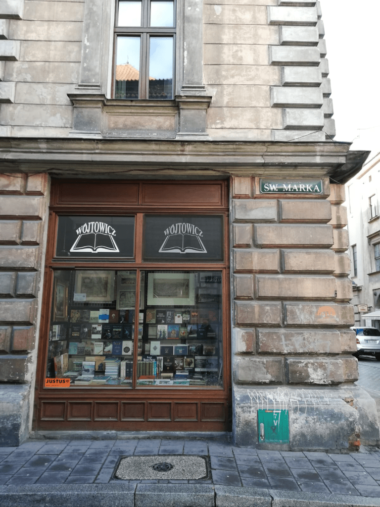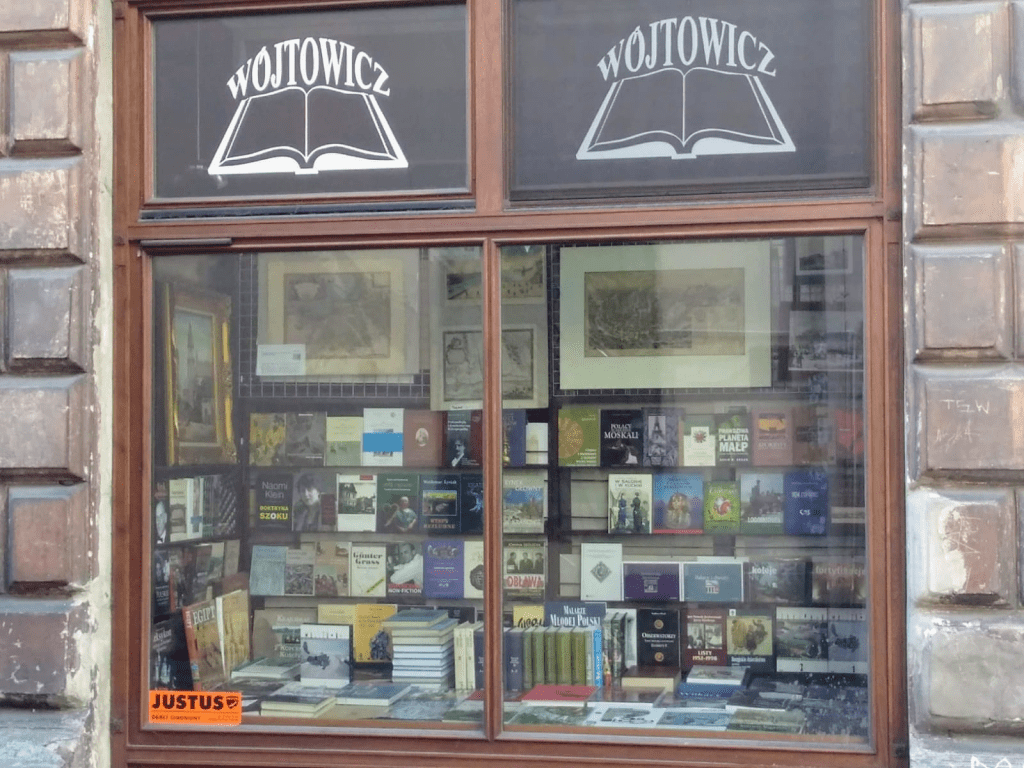 Al poco tiempo de andar, junto a Laura, nos atrae una vieja librería que asoma ni bien salimos de nuestro alojamiento en la calle Tomasza: la librería Wojtowicz. En sus vidrieras relucen abundantes libros de tapa dura de arte, filosofía, religión, de notable calidad de edición.