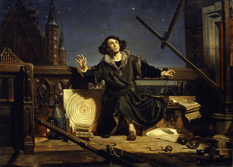 En el Collegium Novun de la universidad está exhibido el cuadro Astrónomo Copérnico o conversaciones con Dios, de 1873, un óleo en lienzo del notable pintor Jan Matejko. Copérnico inició la demolición de la física aristotélica-tomista encorsetada en un universo esférico y cerrado con la Tierra inmóvil en su centro (geocentrismo). Al postular que la tierra se mueve en torno del sol (heliocentrismo) desde el cambio astronómico, Copérnico