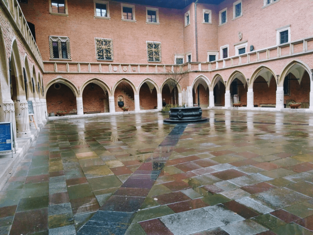 Al recorrer su patio central rodeado por gruesos muros y techos de tejas rojas no puedo evitar emocionarme al recordar que uno de los alumnos de la universidad fue Copérnico, quien seguramente deambuló por aquí ya apasionado por escrutar el cielo de la noche, lo que lo llevó a determinar que la Tierra se mueve alrededor del Sol, y no al revés.