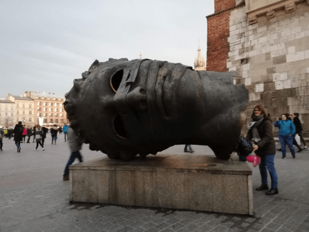En la plaza, vemos también el monumento a Adam Mickiewicz, otro poeta y patriota polaco muy importante en la historia de su país. Y la Torre del Ayuntamiento, a un costado de la cual se encuentra una singular cabeza tumbada…