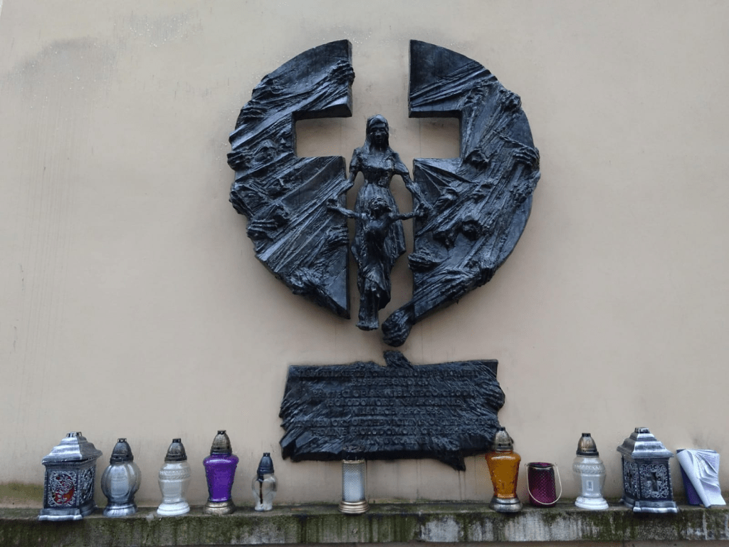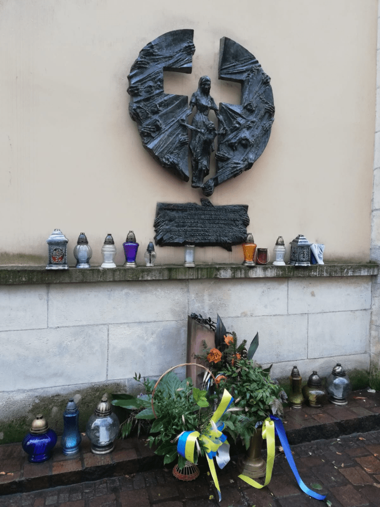Y cuando salimos de allí, la sorpresa por el mero deambular nos demuestra que es una experiencia potencialmente inagotable, porque en el límite del casco histórico, no muy lejos de la universidad, encontramos un pequeño altar, con la imagen de una virgen rodeada de vasos con flores. Es un lugar de recuerdo del Holomodor, el genocidio ucraniano. La gran hambruna provocada por el gobierno soviético de Stalin entre 1932 y 1933, en la puja por la colectivización de la tierra a la que muchos ucranianos se resistían, y que habría causado entre 1.5 a 10 millones de víctimas.
