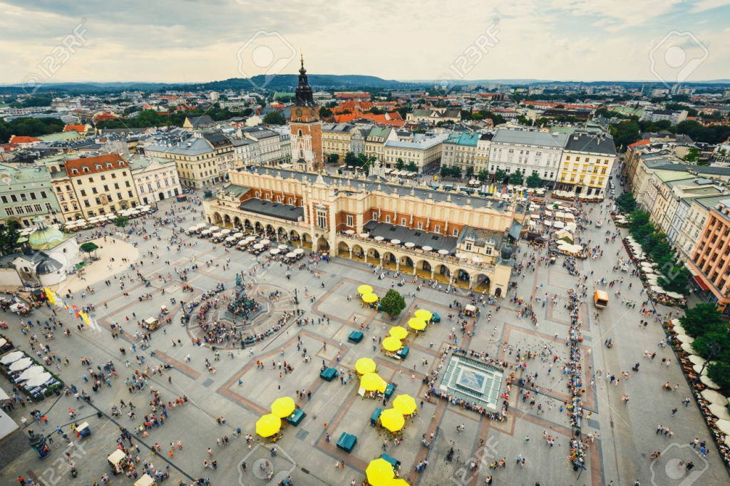 Trazada en 1275, es la plaza de origen medieval más grande de Europa. En su centro está La lonja de los Paños o Sukiennice, un edificio que impresiona con sus 108 metros de largo y 10 de anchura. Alcanzó esas proporciones en tiempos de Casimiro el Grande. Luego de quemarse en la época renacentista, fue reconstruido con la intervención de manos italianas, las de Santi Gucci, artista de corte, y de Giovanni Maria Mosca, arquitecto, escultor, y gran medallista de la época manierista.