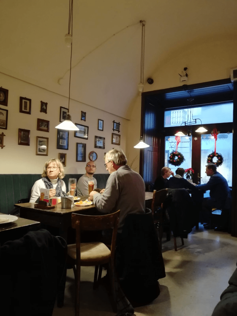 Me sorprende la insistencia con la que observa la vidriera de la librería Wojtowicz. Fuma un cigarrillo. Tiene un sobretodo con su solapa alzada. Quisiera hablar con él, pero no sé polaco. Desisto. Descansamos. Volvemos a las calles. Repetimos ya cierta rutina. Y asaltados por el apremio de comer algo, en un bar disfrutamos con Laura de unos pierogi, un plato tradicional de la cocina polaca, relleno de hongos con salsa de cebolla.
