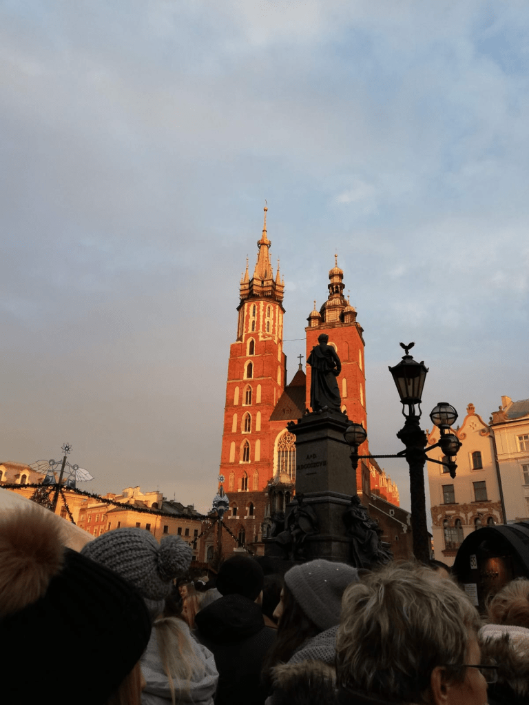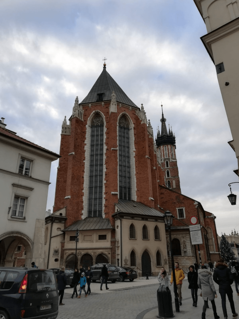 En unos de los extremos de la gran plaza se yergue la Basílica gótica de Santa María. Sus altas paredes de ladrillos fueron construidas sobre las ruinas de una iglesia anterior devastada por los mongoles. Cada hora, desde la parte alta de la torre norte, un trompetista toca la melodía tradicional polaca Hejnal mariacki, que se transmite al mediodía por la radio a todo el país. La costumbre recuerda la muerte por un tiro en la garganta de un trompetista en el siglo XIII, mientras con su instrumento daba la alarma de la llegada de los feroces mongoles. Una diaria evocación de un héroe anónimo que insiste en su advertencia desde los tiempos medievales.