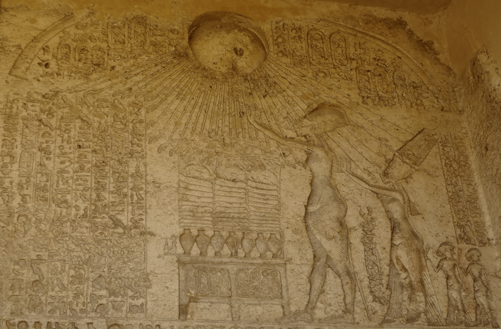 Siempre entre las inmensas planicies doradas e inundadas de sol, y bajo las frecuentes olas de areniscas que nublaban la vista, observamos también las extensiones cubiertas de cientos o miles de pequeños sepulcros esparcidos a la intemperie, donde alguna vez yacieron los pobladores de la rebelde ciudad imperial: artesanos, maestros, carniceros, tejedores, soldados, simples sirvientes, amas de casa, abuelas, niños. Y en los extremos, el testimonio de una de las obsesiones del monarca sublevado: la de marcar los límites. Es así que en las laderas de las colinas rocosas que rodean el sitio, hay una cantidad importante de estelas fronterizas cuidadosamente grabadas en honor de Atón y de sus servidores en la Tierra: los trece hitos demarcatorios ubicados en la banda oriental del Nilo (donde estaba la metrópolis en sí misma), junto a otros tres del lado occidental (extensión agrícola desde donde se abastecía la ciudad), permiten al visitante del siglo XXI visualizar con precisión las características y la extensión del territorio atoniano. En un momento tuve la necesidad de apartarme del pequeño grupo, para ascender en soledad a lo alto de una de las colinas, escalando las rocas. Y fue desde aquellas alturas que pude alcanzar una visión global de la ciudad-proyecto, derrotada pero triunfante, que aún palpita de alguna forma bajo los vientos pedregosos del desierto. Entre los cementerios ocultos que la rodean, se aprecian trozos de columnas y otras estructuras que permiten intuir el Gran Templo, el Pequeño Templo, las Oficinas de Correspondencia, las residencias de los monarcas y de sus cortesanos, los caseríos en que habitaba el resto de la población, los grandes patios donde multitudes adoraban al Sol-Atón, y la ancha Avenida Real que atravesaba todas estas edificaciones.