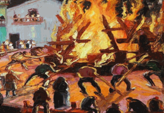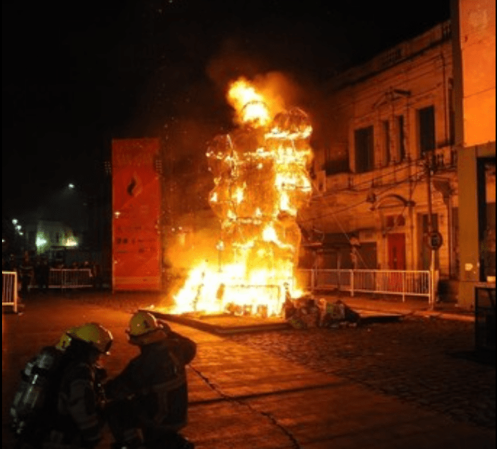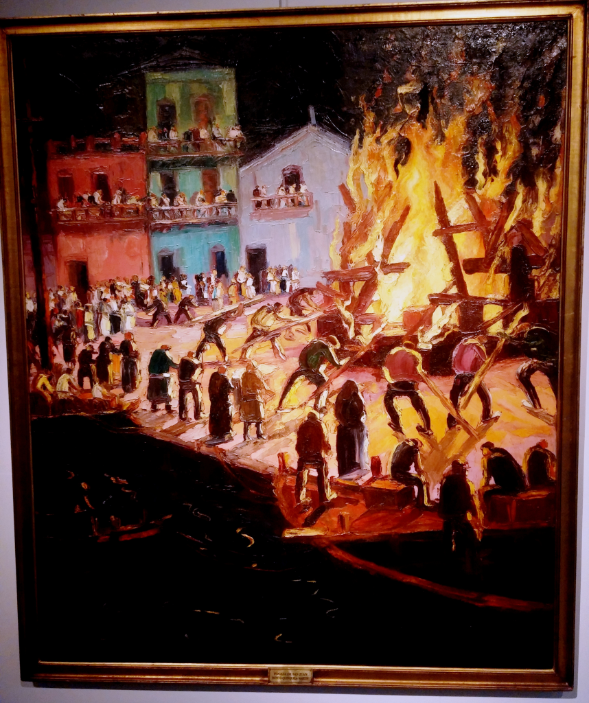 En 1923, Jorge Luis Borges, después de regresar de un largo viaje formativo en Europa, busca crear una poesía que exprese una mitología poética de la gran ciudad. Su primer poemario en este rumbo es Fervor de Buenos Aires(1924). Aquí, incluye este poema, en el que el escritor posa su mirada asombrada ante el trepidante fuego purificador de las hogueras en la entraña de un barrio diferente. Calles en las que se quema un muñeco, arde el fuego, baila la fuerza de las llamas no sólo para una simbólica purificación, sino también para inducir el recuerdo de que esas calles «fueron campo un día»; es decir, donde ahora se endurecen las formas de la ciudad antes palpitaba, desnuda, la tierra.