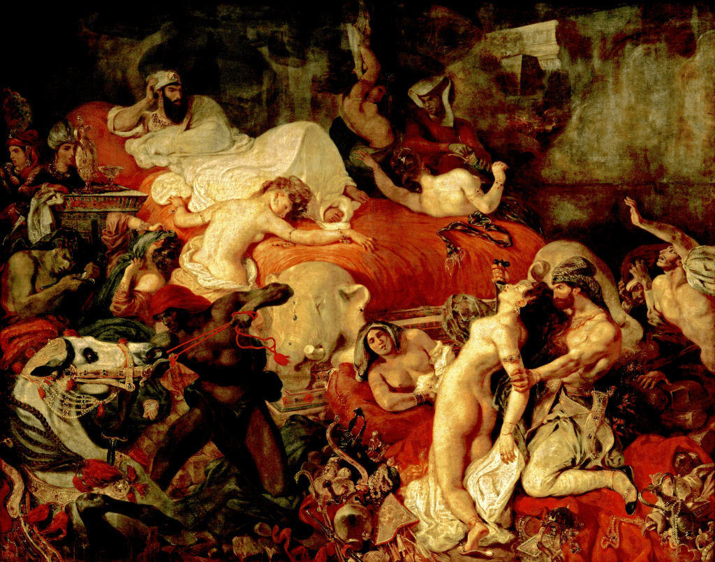 Tras ser derrotado, Sardanápalo, un rey asirio del siglo VII ac, antes de rendirse, ordena la ejecución de todas las mujeres, concubinas y esclavos. Desde un rincón de penumbra, con fría serenidad, el rey contempla la matanza; y, en especial, se concentra en la muerte inminente de una bella concubina desnuda, joven y bella, a punto de ser traspasada por una daga de un vasallo. La violencia y el dramatismo convierten a la pintura en un ejemplo de dramática intensidad. Es la antítesis de la serenidad neoclásica.