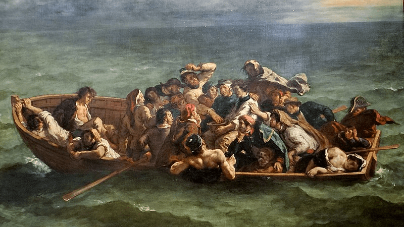 (11) El naufragio verdadero que representa el cuadro de Géricault es la tragedia de la fragata de la marina francesa Méduse ante la costa de Mauritania, en 1816. Alrededor de 150 personas se amontonan en un bote. Solo 15 sobrevivieron tras 13 días a la deriva en el mar. Para los sobrevivientes fueron días de hambre, deshidratación, canibalismo y locura. El hecho se convierte en un escándalo a gran escala, de proporciones internacionales. El naufragio no se entiende como un accidente, sino como resultado de la incompetencia del capitán francés nombrado al frente de la nave por la monarquía francesa borbónica de Luis XVIII, tras su restauración en el poder, en 1818. En cuanto a El naufragio del Don Juan, de Delacroix, este cuadro se inspira en una escena del Canto II del poema de Lord Byron, Don Juan, que deja inconcluso por su muerte en 1824. Allí, se alude a un naufragio; y entre los náufragos se encuentran don Juan y su tutor Pedrillo. Se echan suertes para determinar quién será víctima del canibalismo para evitar la muerte por inanición de los demás infortunados. Según el poema, la desgracia recae sobre Pedrillo, que no se puede distinguir entre los desgraciados. Luego del acto caníbal, todos van enloqueciendo, y finalmente mueren. Solo queda vivo don Juan, quien llega hasta las islas Cíclades, en el Egeo. Delacroix logra transmitir el impacto emocional de la situación trágica. Cada personaje es pintado con su singularidad y sufrimiento personales.