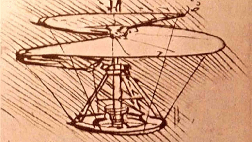 El Helicóptero o tornillo aéreo, invento proyectado por Da Vinci, en 1490. Una máquina concebida a partir del funcionamiento de los tornillos. Luego, esta idea se convertirá en el actual helicóptero.