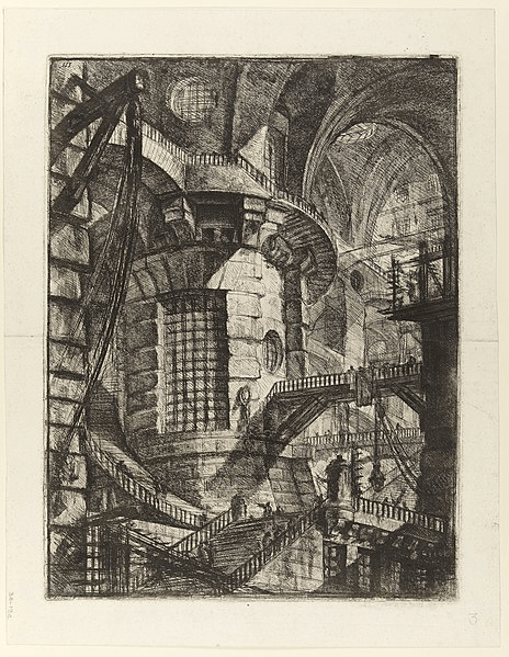 Los dibujos de Leonardo son el goce de la invención que anticipa. Su espíritu es la antítesis del universo dibujado por Giovanni Battista Piranesi. Entre 1750 a 1760, el veneciano Piranesi publica sus dibujos y grabados de las carceri d’ invenzione o «las cárceles imaginarias». Este dibujo no imagina la liberación de la posibilidad creadora. El imaginar piranesiano es expresión del «paisaje interior» del sujeto moderno; el sujeto que se recluye dentro de un yo angustiado, el sujeto que cae en su cárcel o laberinto interior. O que ve la grandeza pasada del arte grecorromano como pérdida, como vacío donde se acumulan ruinas. Así lo testimonian los grabados piranesianos de la Antichitá Romana.
