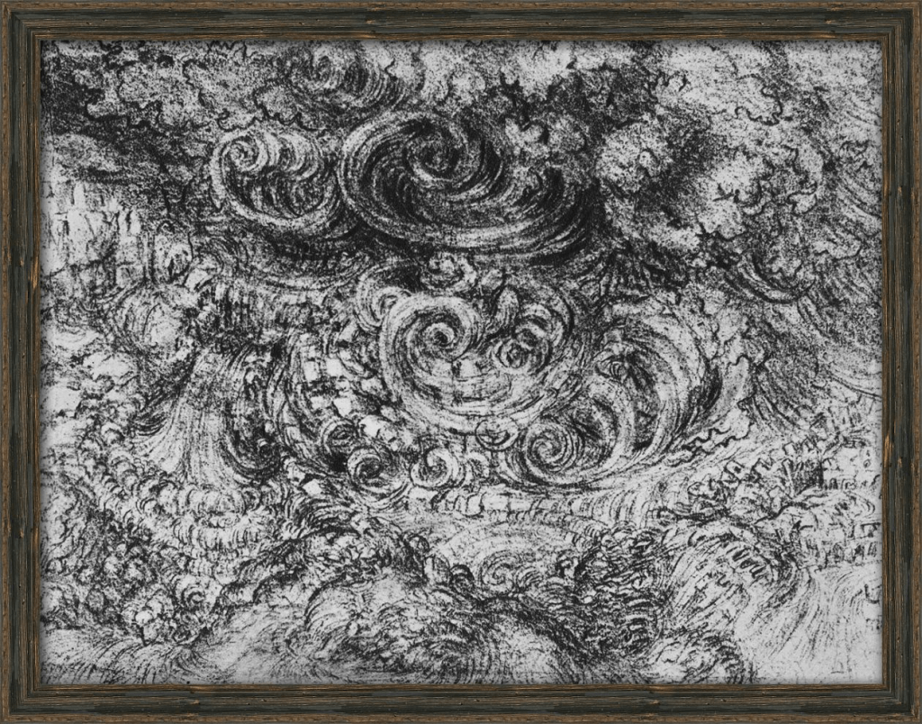 Los desatados y coléricos torbellinos de aire destruyen toda proporción y equilibrio. Los furiosos remolinos siembran la conmoción en el cielo y la tierra. Esta naturaleza estrangulada por el cataclismo desintegra toda bella proporción. Recrear esta turbulencia exige una salida de todo equilibrio entre las formas. La imagen determinada por la racionalidad de la proporción cede ante lo indeterminado, entendido como desorden y agitación. Lo indeterminado y sugerente dominan los dibujos que Leonardo dedicó al Diluvio.