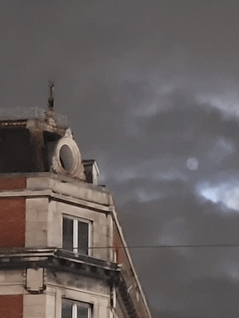 Regresamos a Dublín. Recorremos nuevamente la calle O’Connell. Exploramos los alrededores, muchos negocios, pubs, una iglesia recogida en su soledad a pesar estar muy cerca de la avenida. Volvemos al Liffey. Como un fino cuerpo etérico, las nubes trasparentan una luna plateada y enigmática al lado de un edificio de una oscura mansarda.
