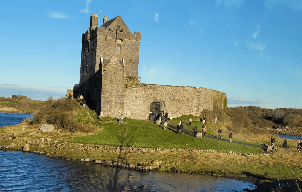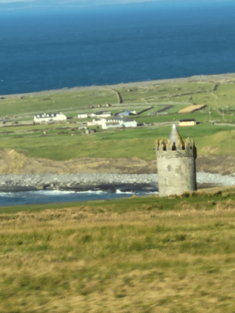 Más adelante en el camino divisamos el castillo de Doongore, en Doolin, condado de Clare, una casa torre circular del siglo XVI, «el fuerte de las colinas redondeadas», que sirve de orientación a los navíos que se aproximan al embarcadero de la localidad. Hoy lugar privado, en 1588, 170 supervivientes de la Armada Invencible fueron capturados, y ahorcados en el castillo y enterrados en un túmulo cercano. También pasamos por el encantador poblado de Lisdoonvara, de poco más de 800 personas, famoso por su música y festivales, y de multicolores fachadas como es norma en los pueblos de Irlanda.