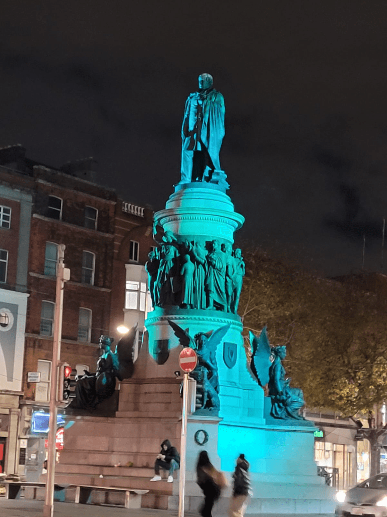 La calle corazón de la ciudad se abre con una estatua maltratada por los pájaros. El monumento de Daniel O’ Connell, el líder nacionalista que luchó por la autonomía de la Irlanda católica bajo el dominio inglés en el siglo XIX.